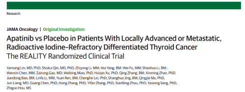 2021年12月16日,权威医学杂志《JAMA Oncology》(影响因子31.777)在线发表阿帕替尼的一项III期临床研究(REALITY)——甲磺酸阿帕替尼片治疗局部进展/转移性放射性碘难治性分化型甲状腺癌(RAIR-DTC)患者的多中心、随机、双盲、安慰剂对照临床研究。此研究由北京协和医院的林岩松教授和南京金陵医院的秦叔逵教授发起,在全国21个研究中心展开,由YY易游m6米乐中央医学事务部团队支持完成。