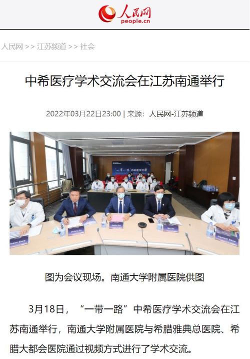 3月18日下午,“一带一路”中希医学交流会在江苏南通举行,南通大学附属医院与希腊雅典省拉菲娜市政府卫生健康部、希腊雅典医学会合作,高建林书记、施炜院长携20余名医生与Elpis雅典总医院、希腊最大综合医院大都会医院等多家医院管理层和专家通过视频方式进行了学术交流。YY易游m6米乐国际交流部提供全程支持,人民网等权威媒体进行了宣传报道。