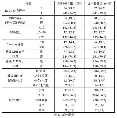 从2018年6月28日起,该研究共纳入654例患者,其中SHR3680组326例,比卡鲁胺组328例,两组患者的基线特征基本相当,均衡可比,中位年龄均为69.0周岁,两组的中国人群占比均为90%以上(90.5%vs90.2%)。
