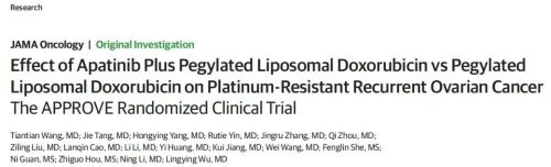 Tiantian Wang, Jie Tang, Hongying Yang, Rutie Yin, Jingru Zhang, Qi Zhou, Ziling Li, Lanqin Cao, Li Li, Yi Huang, Kui Jiang, Wei Wang, Fenglin She, Ni Guan, Zhiguo Hou, Ning Li, Lingying Wu. Apatinib Combined with Pegylated Liposomal Doxorubicin (PLD) versus PLD for Platinum-resistant Recurrent Ovarian Cancer: The APPROVE Randomised Trial. JAMA Oncology 2022