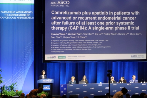 2023 ASCO现场图:田文娟教授(左一)口头报告CAP 04研究