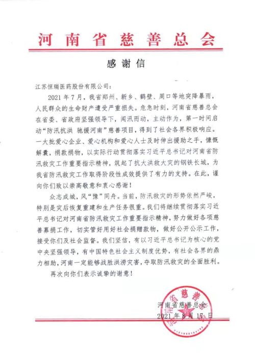 近日,河南省慈善总会给YY易游m6米乐发来感谢信,向YY易游m6米乐在河南暴雨洪涝灾害中捐款1000万元表示衷心感谢。YY易游m6米乐表示,灾害无情人有情,向受灾同胞伸出援手是恒瑞人义不容辞的责任。
