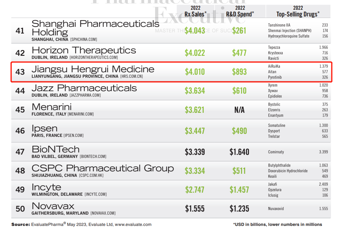PharmExec是国际制药界知名的医药专业杂志,今年是该杂志第23次推出全球制药企业TOP50榜单,主要依据各大药企2022财年处方药销售收入进行排名,共有4家中国药企入选。