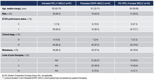 该I期研究(NCT03774979)分为剂量递增和剂量扩展2部分试验,随后在不同肿瘤类型、基因突变或既往经治的多个队列中进行临床扩展研究。本次ESMO ASIA大会中展示了3个NSCLC临床扩展队列的结果。队列1纳入未接受全身化疗,PD-L1 TPS≥1%的患者;队列2纳入既往接受至少一线EGFR TKI标准治疗失败的EGFR敏感突变患者,接受标准治疗耐药或没有有效标准治疗的方案的EGFR突变患者;队列3纳入既往接受抗PD-1/PD-L1单抗治疗后进展且最多接受3线治疗的患者。符合条件的患者给予SHR-1701 30 mg/kg,每3周1次。主要终点为客观缓解率ORR(RECIST v1.1)。次要终点为安全性、最大耐受剂量(MTD)及II期推荐剂量(RP2D)。