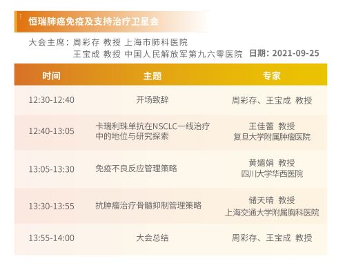 9月25日,恒瑞肺癌免疫及支持治疗卫星会于线上顺利召开。本次会议特别邀请同济大学附属上海市肺科医院周彩存教授和中国人民解放军第960医院王宝成教授共同担任大会主席,复旦大学附属肿瘤医院王佳蕾教授、四川大学华西医院黄媚娟教授和上海交通大学附属胸科医院储天晴三位杰出中青年专家相约线上,分别就艾瑞卡在NSCLC一线治疗中的地位与研究探索、免疫不良反应管理策略和抗肿瘤治疗骨髓抑制管理策略三部分内容做了精彩授课。