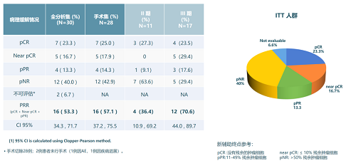 在完成手术的28例患者中,16例(57.1%)获得病理学缓解,包括7例(25.0%)实现pCR、5例(17.9%)接近病理完全缓解(near pCR),4例(14.3%)部分病理学缓解(pPR)。其中,12例(42.9%)达到主要病理学缓解(MPR,包括pCR和near pCR)。在Ⅱ期患者中,3例(27.3%)达pCR,1例(9.1%)达pPR,pNR率为63.6%;在Ⅲ期患者中,4例(23.5%)达pCR,5例(29.4%)接近pCR,3例(17.6%)达pPR,pNR率为29.4%。