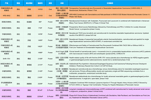 在消化系统肿瘤领域,恒瑞创新产品相关研究共入选2项口头报告、10项壁报和2项电子壁报,共14项研究。除了明星药物卡瑞利珠单抗和阿帕替尼外,还有5篇阿得贝利单抗治疗消化系统肿瘤的研究入选。此外,HRS-4642、瑞拉芙普-α注射液(SHR-1701)等未上市创新产品也有相应研究入选。随着新老药物前沿研究的不断推进,有望为消化系统肿瘤患者带来新的福音!